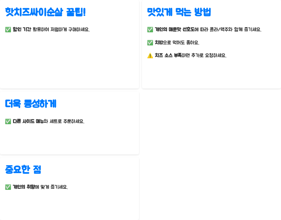 이 글이 맘스터치 핫치즈싸이순살을 선택하는 데 도움이 되었기를 바랍니다!