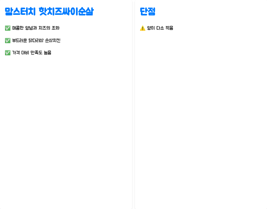 맘스터치의 다른 메뉴, 특히 싸이순살과 비교해보면, 핫치즈싸이순살은 매콤한 양념과 치즈 소스가 추가된 것이 특징입니다.