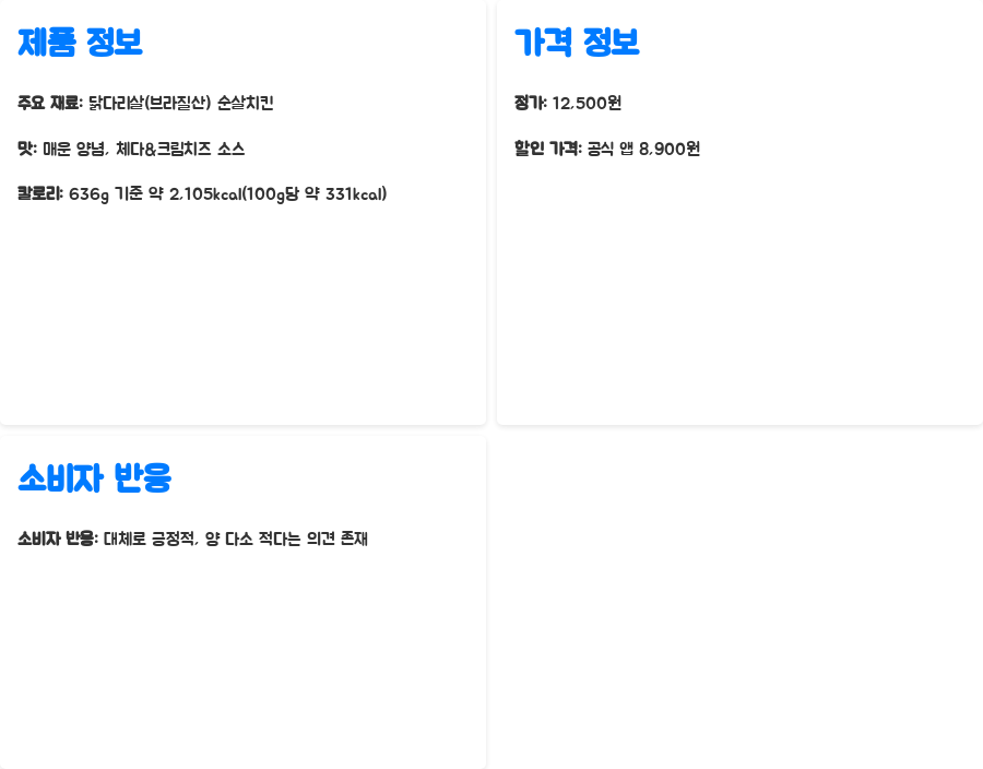 | 맛 | 매운 양념, 체다 & 크림치즈 소스 조합 |